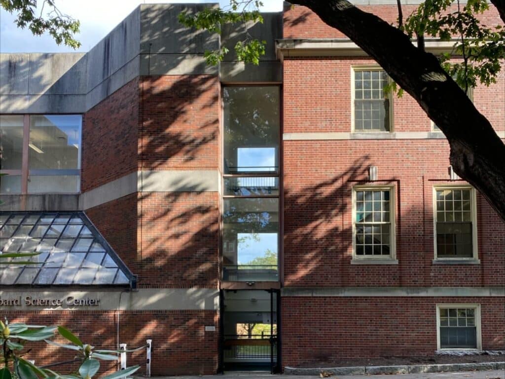 To blend in with the primarily Georgian Revival architecture of Regis College, Sasaki, Dawson & DeMay Associates combined traditional brick materials with modern forms. The most iconic facade of the building is a series of massive triangular shafts which play two roles by both housing the complex mechanical equipment runs necessary in a modern science building and acting as sun baffles for the large northeast facing windows. The southern facade uses the steep grade change to create a more human scale which mimics the rest of the small campus. The stark triangular facade is brought down in scale to manage sunlight in the smaller office spaces. A glass entryway splits the old building from the new, allowing the original building to maintain its traditional rectangular design while the brick and concrete draws the buildings together in view.
