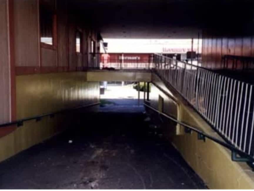 Unfortunately the new slowly became the old and not even 15 years later the latest mall innovation would move in right next door when the Natick Mall became one of the first enclosed shopping plazas on the East Coast. The two grew almost symbiotically for many years, but slowly the newer, more comfortable mall drained Shoppers’ World of its major tenants. By the 1990s, the building was showing its age. The white walls had been painted over – first a green and then brick red. The ramps and causeways had become dark and dirty and the rotating park attractions dwindled away. In 1994, the majority of the buildings were razed and the green park which had served as the heart of the facility for almost half a decade was replaced with another sea of parking.